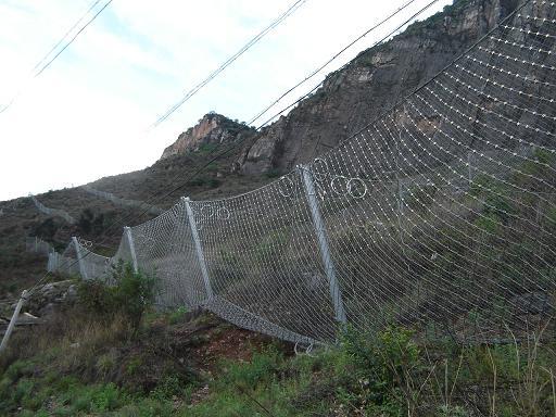 被動防護網主要是由鋼絲繩網(需攔截小塊落石時附加一層鋼絲格柵)、固定系統(錨桿、拉錨繩、基座和支撐繩)、減壓環和鋼柱四個主要部分構成, 前者為其特征構成。其防護能量一般為150KJ-2000KJ,特殊設防能高達5000KJ。它的主要特點就是柔性和攔截強度足以吸收和分散傳遞 500KJ以內的落石沖擊動能,消能環的設計和采用使系統的抗沖擊能力得到進一步提高防護網與剛性攔截和砌漿擋墻相比較,改變了原有施工工藝,使工期和資 金得到減少。產品呈網狀,視覺干擾下,便于人工綠化,利于環保,對于其防護區域內可以充分的保持土地、巖石的穩固,通過人工實施植草、植樹的綠化作用。