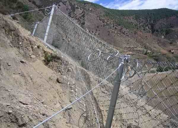 主要材質:鋼絲繩網、支撐繩和減壓環構造:由鋼絲繩網或環形網(需攔截小塊落石時附加一層鐵絲格柵)、固定系統(錨桿、攔錨繩、基座和支撐繩)、減壓環和鋼柱四個主要部分構成。