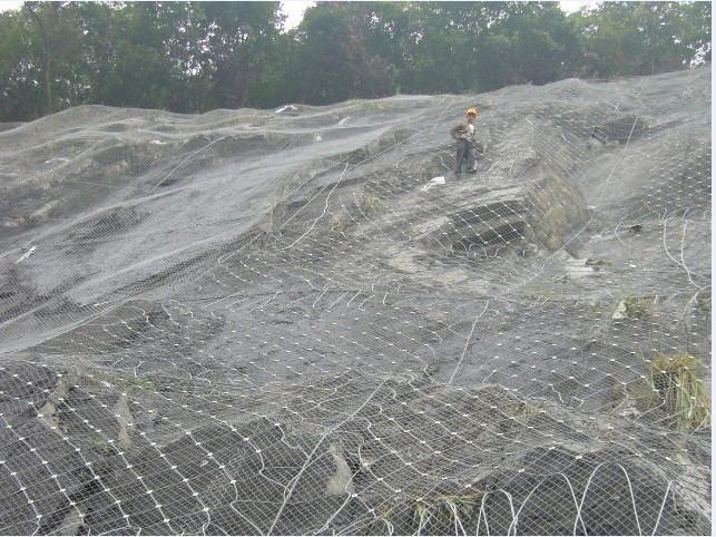 護(hù)坡網(wǎng)具有高柔性,高防護(hù)強(qiáng)度,易鋪展性。適應(yīng)任何坡面地形,安裝程序標(biāo)準(zhǔn)化、系統(tǒng)化。 護(hù)坡網(wǎng)系統(tǒng)采用模切化安裝方式,工期短,施工費(fèi)用低。 護(hù)坡網(wǎng)的主要構(gòu)件:邊沿(或上沿)鋼絲繩錨桿+支撐繩+縫合繩(D0/08/300鋼繩網(wǎng)+上下沿錨固+上下沿(或橫向)支撐繩) 邊沿(或上沿)鋼絲繩錨桿+支撐繩+縫合繩(D0/08/300鋼繩網(wǎng)+上下沿錨固+上下沿(或橫向)支撐繩)。